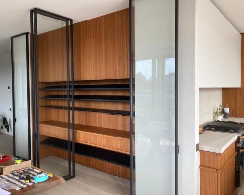 35530 Interieur - Opbergen - Smeedijzeren barkastdeuren + legbanken + glazenhouder - Inox gelakt