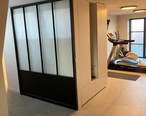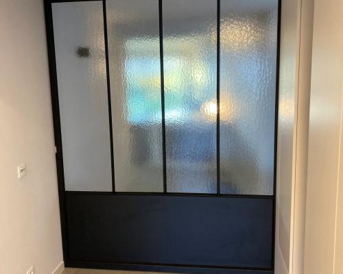 De smeedijzeren - stalen schuifdeur heeft onzichtbare wielen en kathedraal glas dat aan beide zijden met een mastiekvoeg in de deur geplaatst is. De G-trekker is in het deurprofiel ingefreesd.