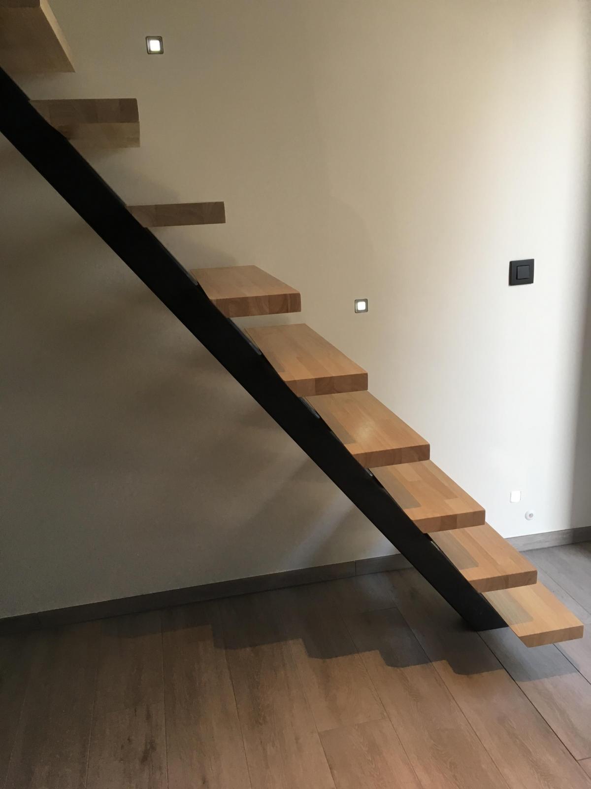 Een trap met één stalen gelakte trapboom en treden in rubberwood die naturel vernist zijn.