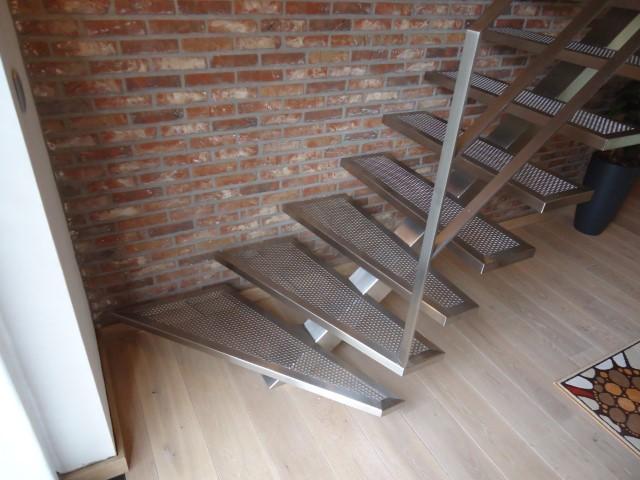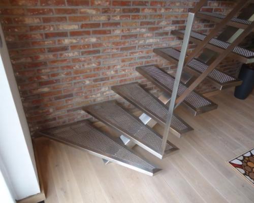 L'escalier droit avec un limon central en inox a des marches perforés. Les première marches sont des marches déplacés.