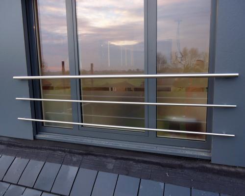 La rampe de fenêtre en inox avec 3 poteaux horizontaux est fixée au mur.