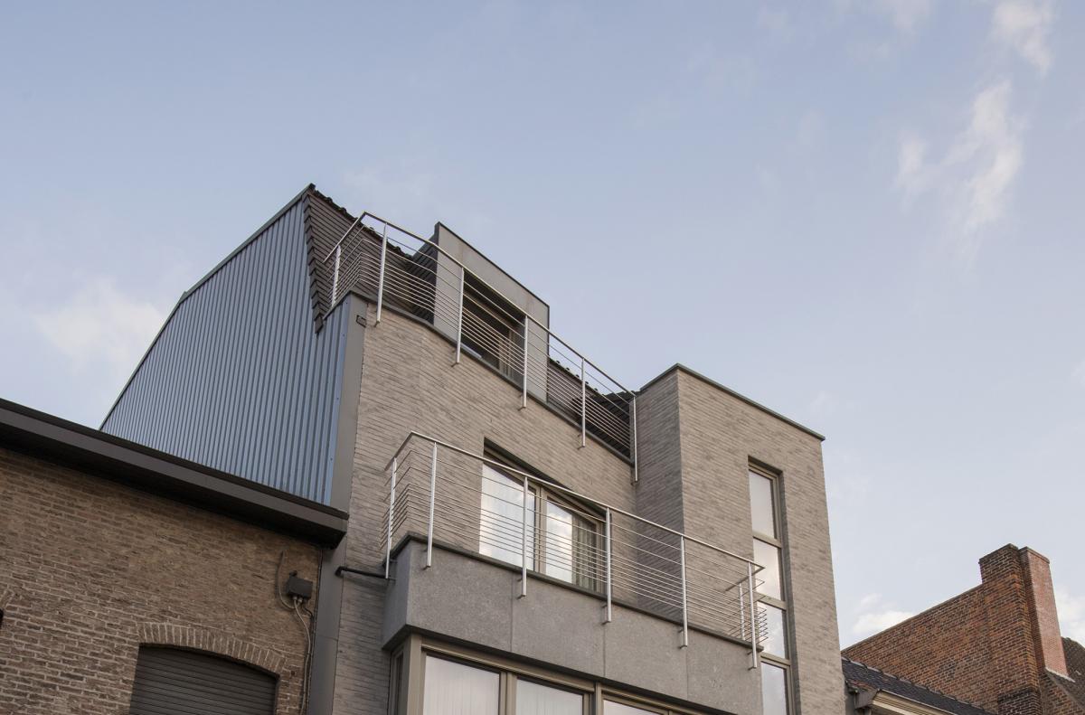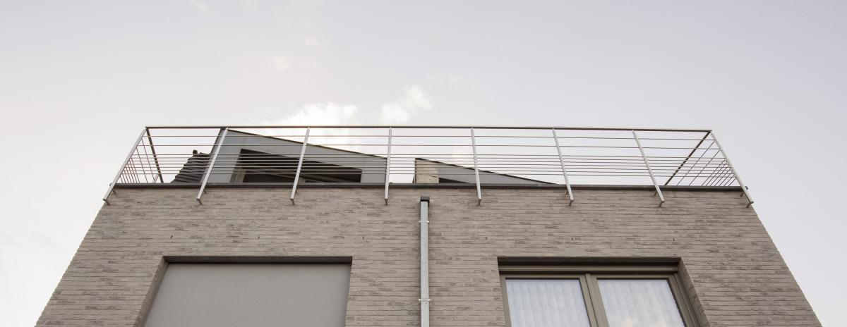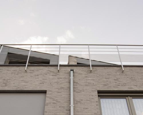 Les rampes et balustrades des fenêtres en inox de cet immeuble d'habitation ont différents poteaux horizontaux et sont fixées au mur.