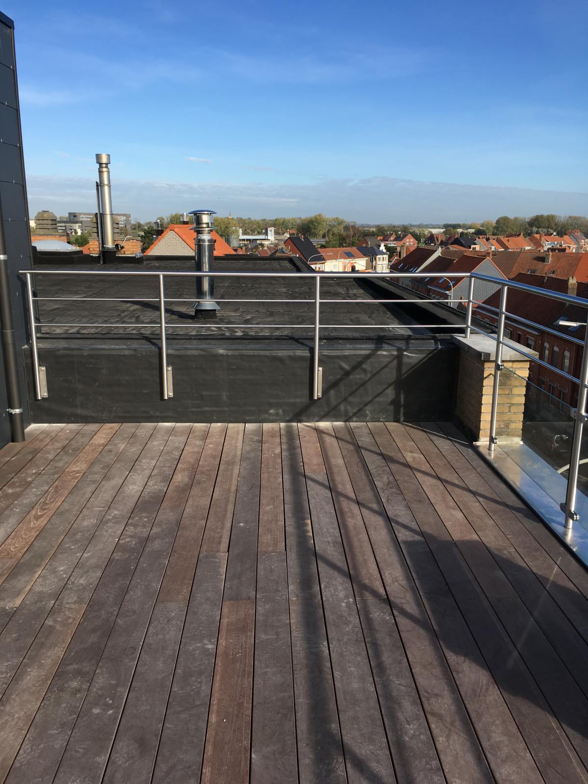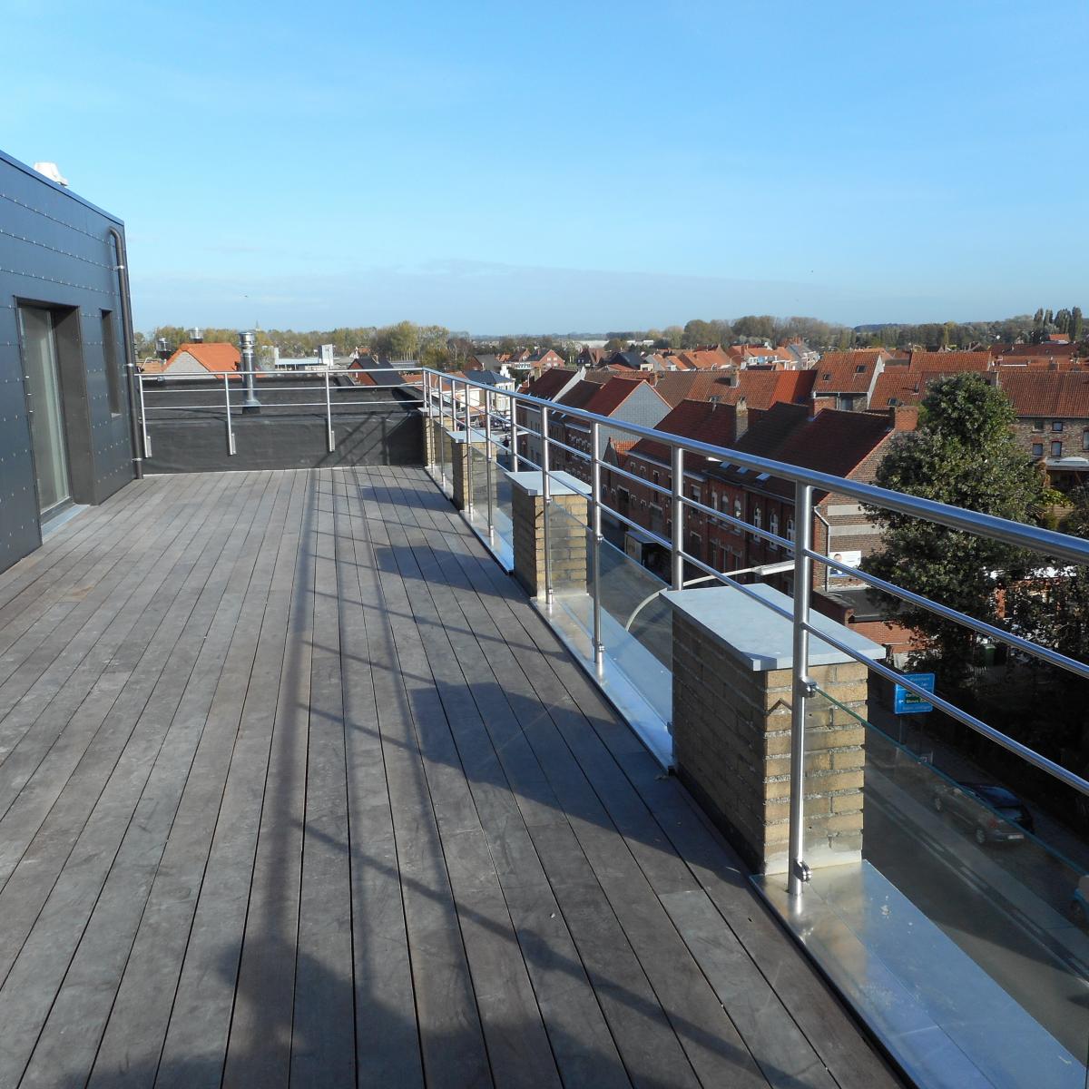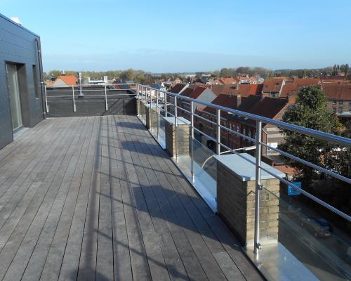 Cette balustrade extérieure est une combinaison d'une balustrade avec des poteaux horizontaux et du verre et d'une balustrade avec uniquement des poteaux horizontaux.