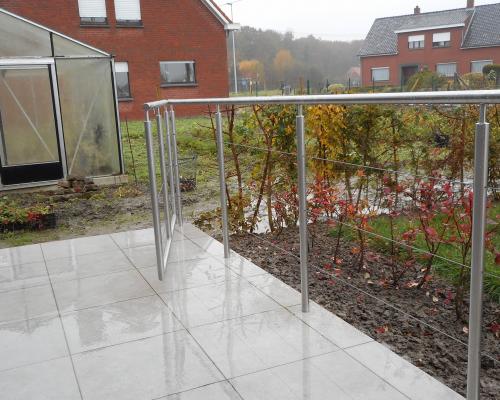 Deze inox tuinbalustrade met afsluithekje heeft horizontale tussenstijlen in inox kabel.