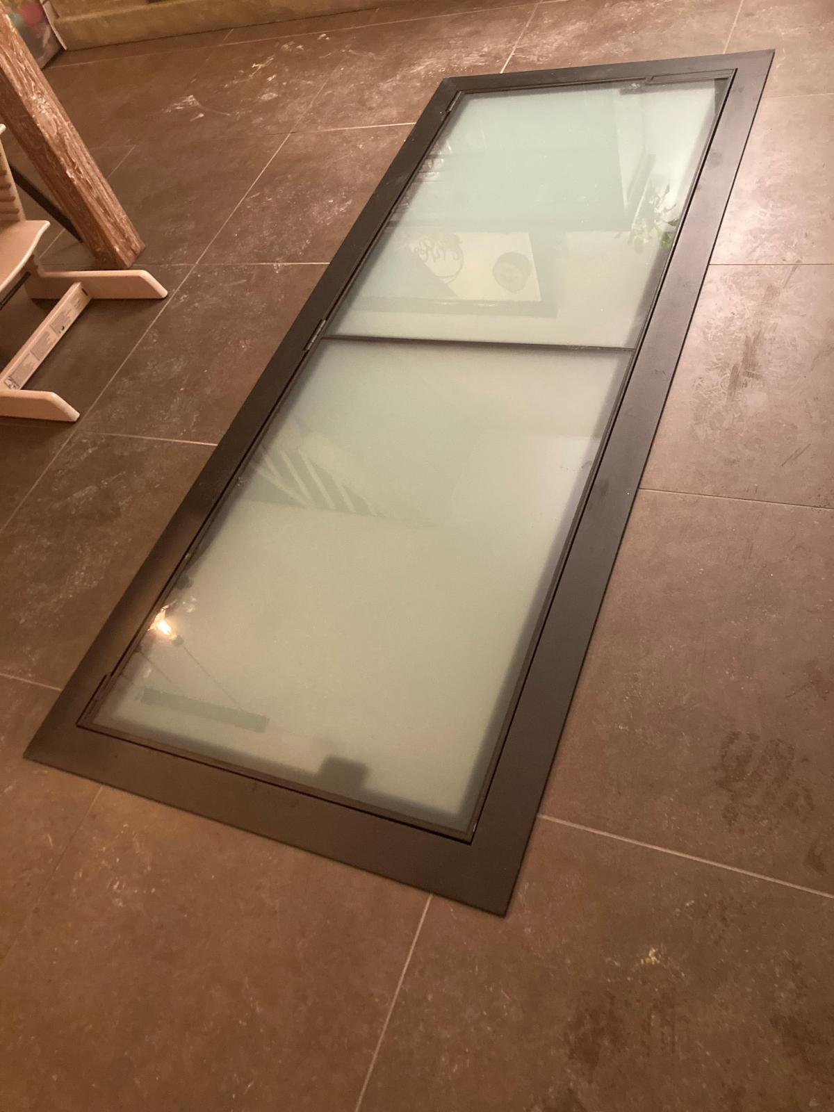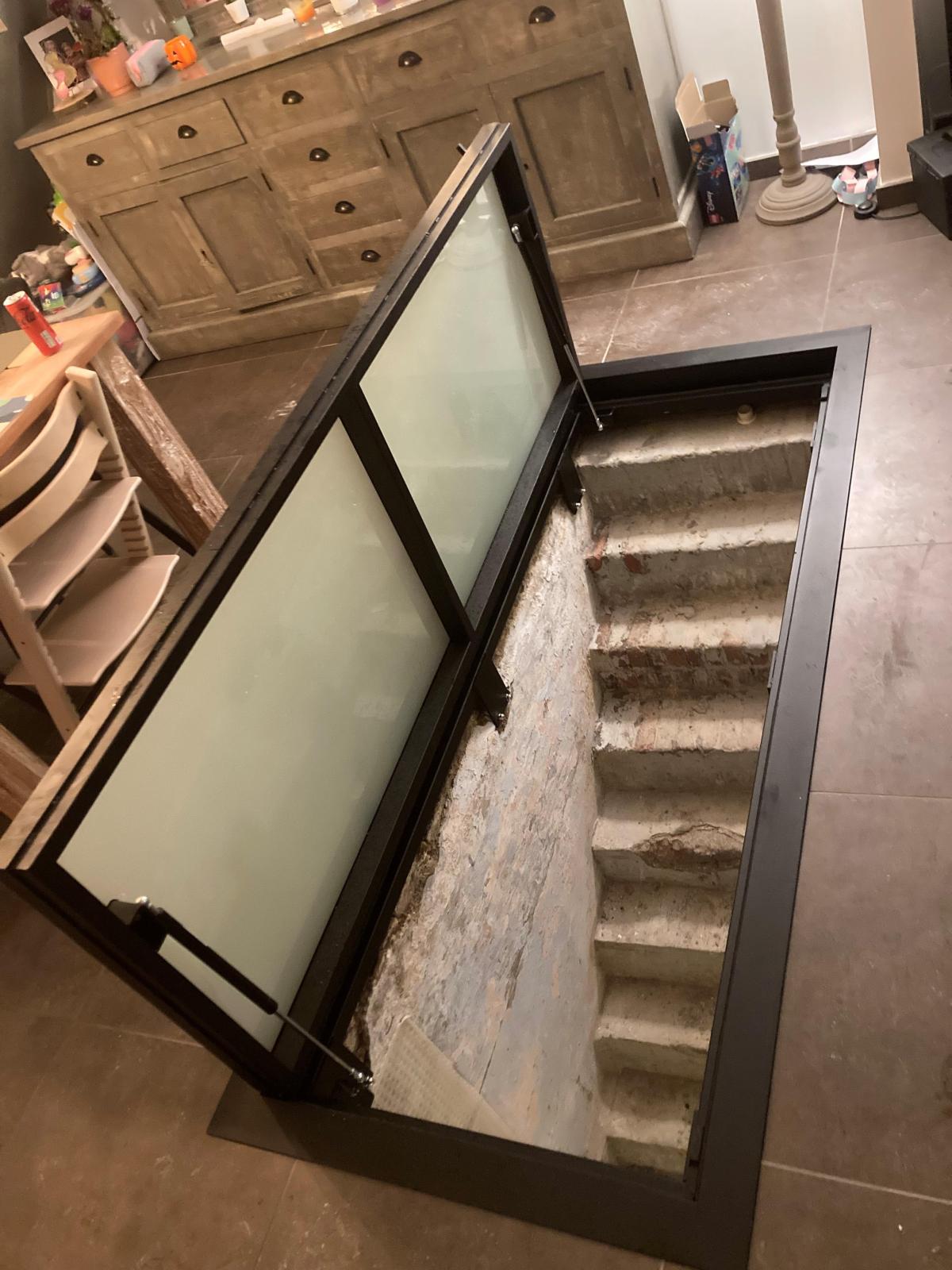 Het inox kelderluik is afgewerkt met opaal glas en het heeft gasdrukveren om het te openen. Let op het ingewerkt handvat.