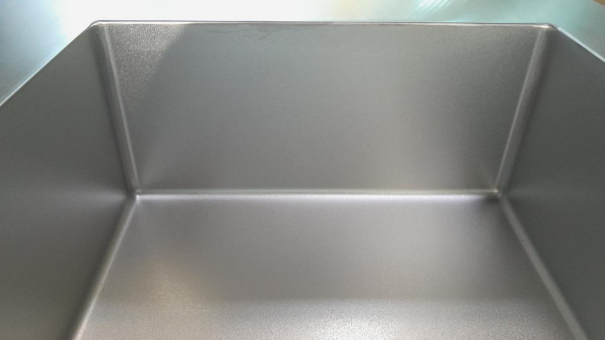 Een spoelbak wordt ingelast in werkblad en volledig opgeschuurd zodat spoelbak en werkblad één geheel vormen.