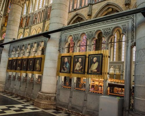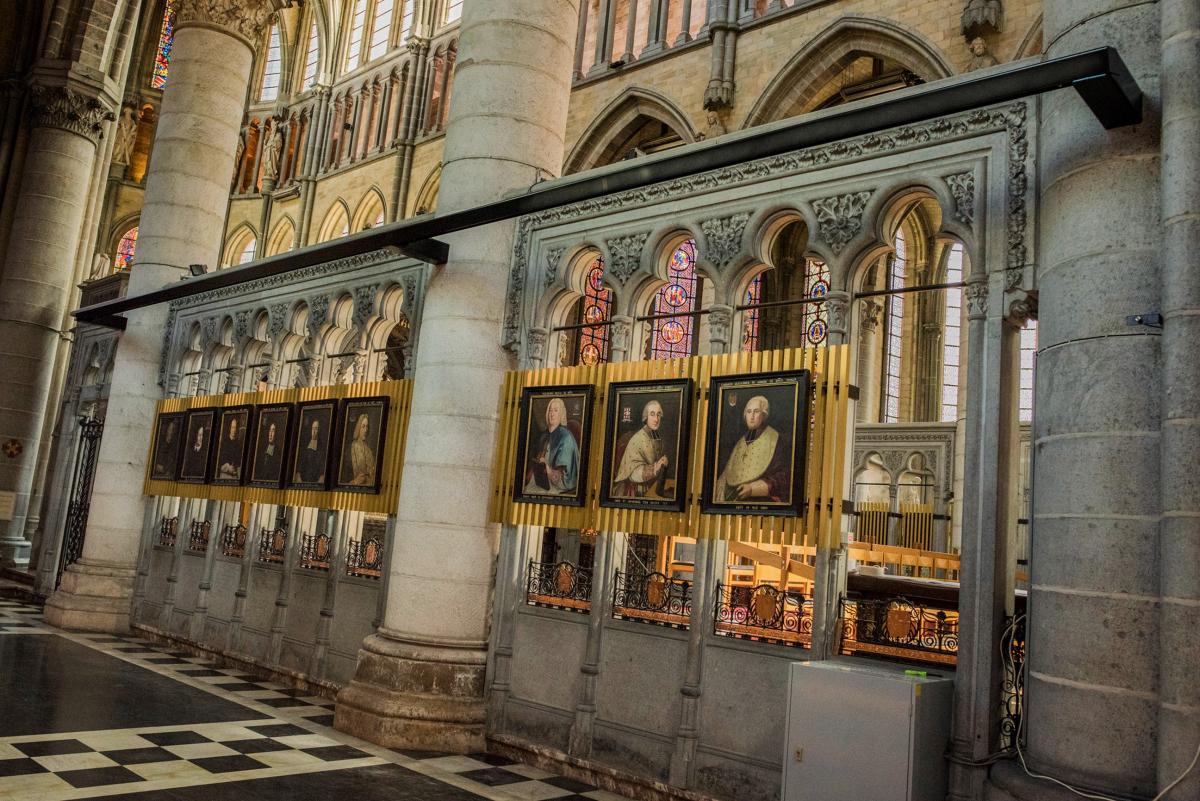 In de kathedraal van Ieper plaatsten we een ophangsysteem in messing waarop de schilderijen bevestigd werden. Boven de schilderijen hangt een verlichtingsarmatuur in gelakt staal.