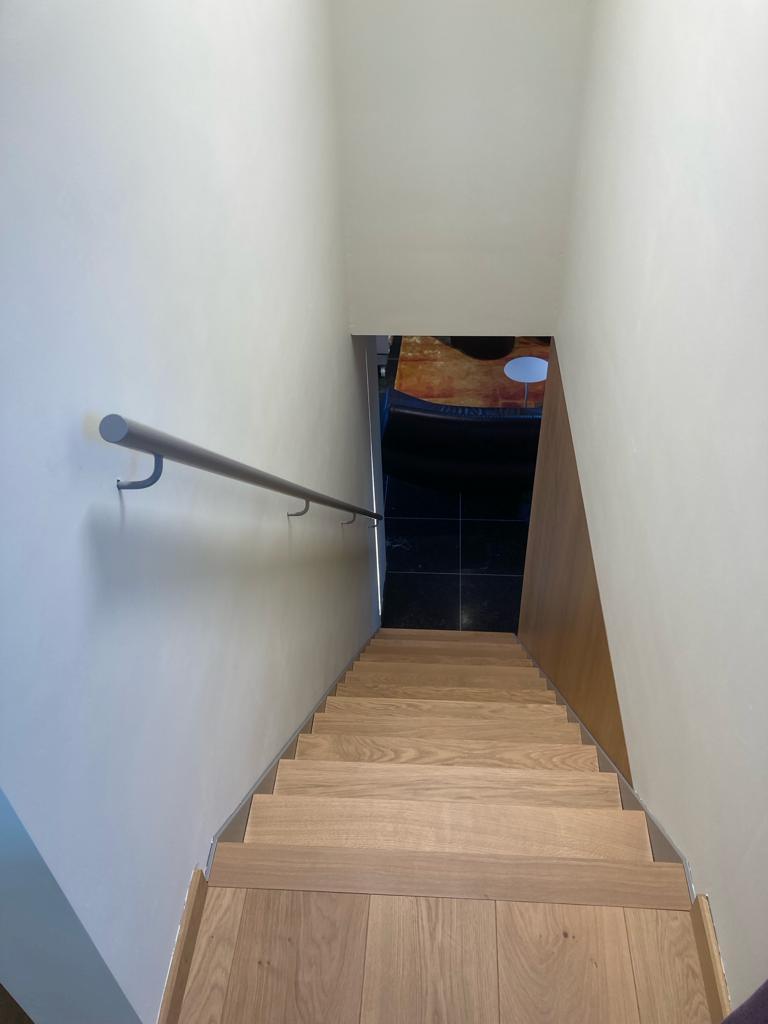 De stalen, gelakte handloop in ronde buis is chemisch verankerd in de muur en is dus niet afneembaar.