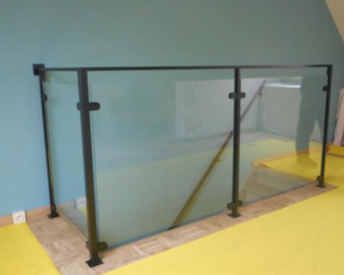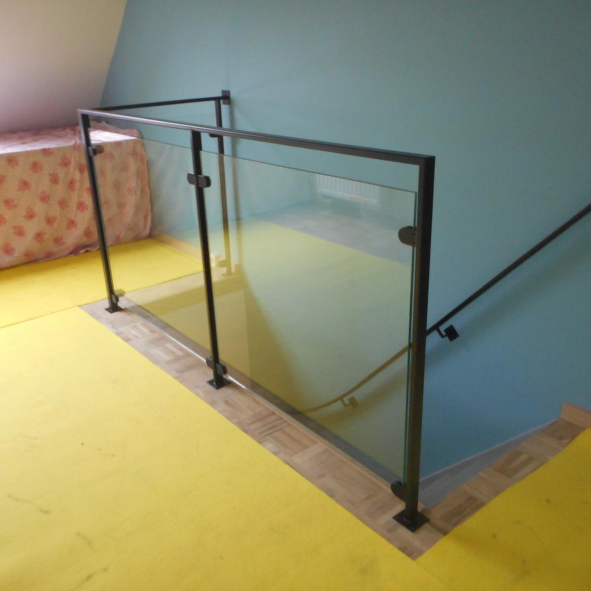 De gelakte stalen balustrade, bevestigd op de vloer is afgewerkt met glaspanelen die geklemd zijn in een glasklem rond een stalen, zwart gelakte omkadering. Een handloop in zwart gelakt staal zorgt voor de nodige veiligheid.