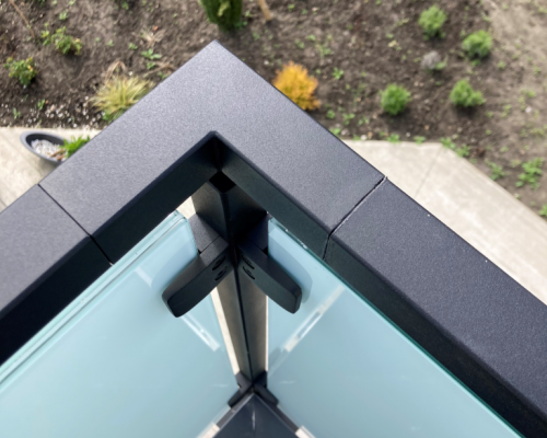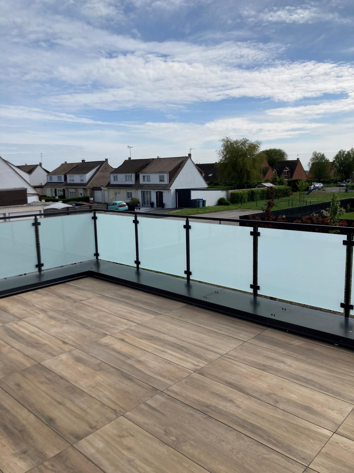 Het mat glas in de balustrade zit geklemd tussen glasklemmen rond een inox gelakt kader.