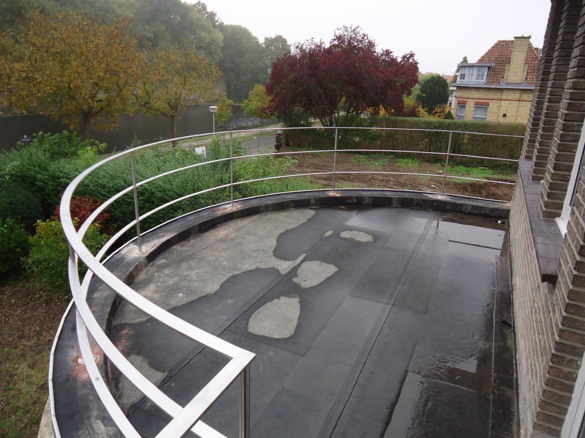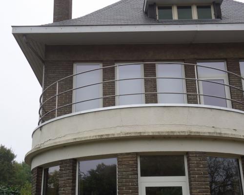 De ronde vorm van deze inox buitenbalustrade zorgt voor een aparte uitstraling. Let op de platte tussenstijlen.