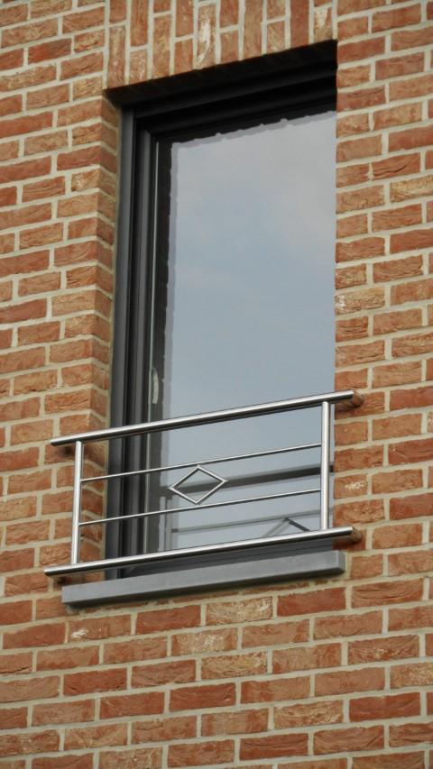 De vensterleuning met horizontale stijlen in inox ronde buis is aan de muur voor het raam bevestigd en zorgen voor de nodige beveiliging. Let op de versiering in het midden van de leuning.