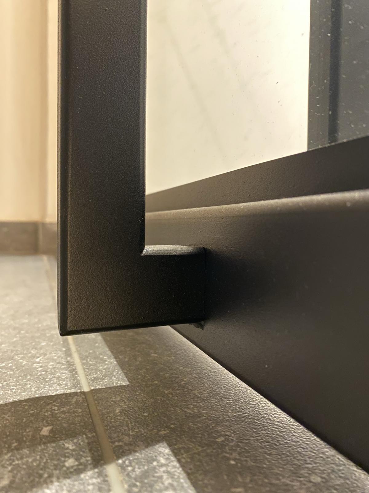 De smeedijzeren - stalen pivot-/taatsdeur heeft ongelijke glasverdeling. De verdeling is met een profiel op het glas gekleefd.