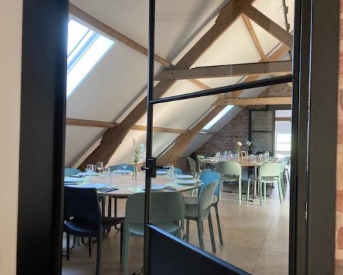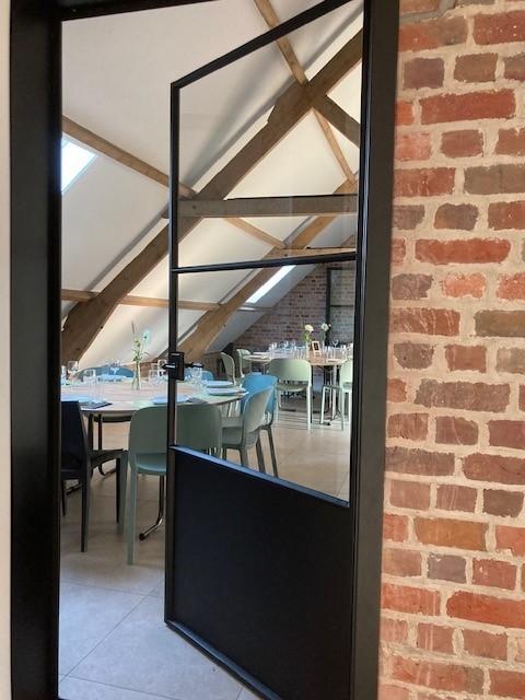 De smeedijzeren - stalen, zwart gelakte scharnierdeur heeft onderaan een plaat met daarboven symmetrische glasverdeling dat afgewerkt is met een brede mastiekvoeg aan beide zijden.