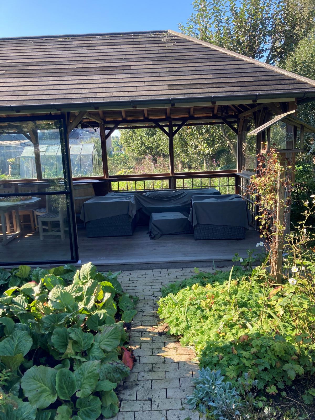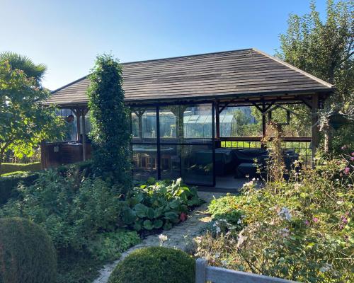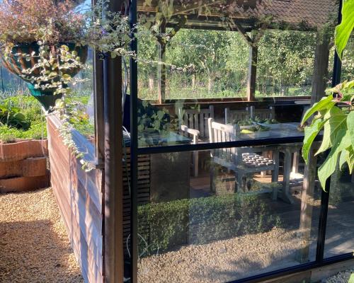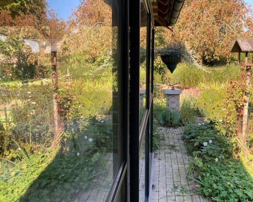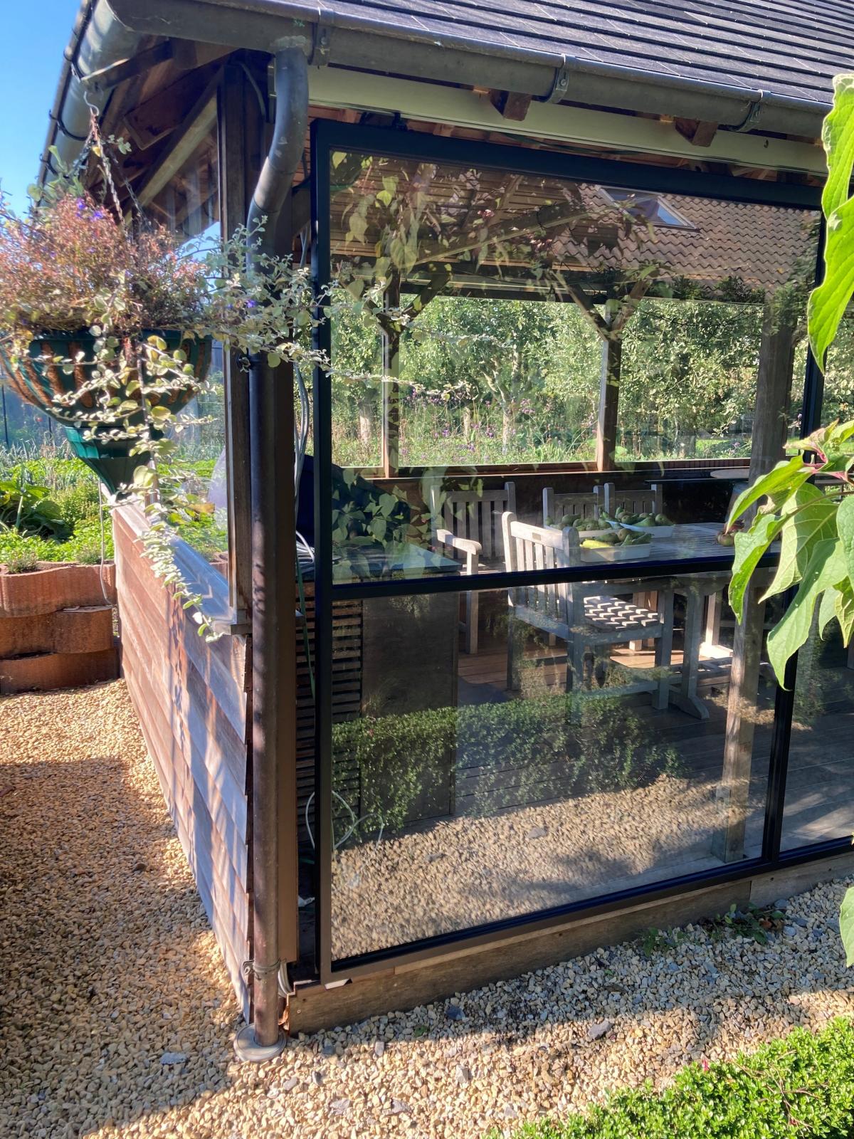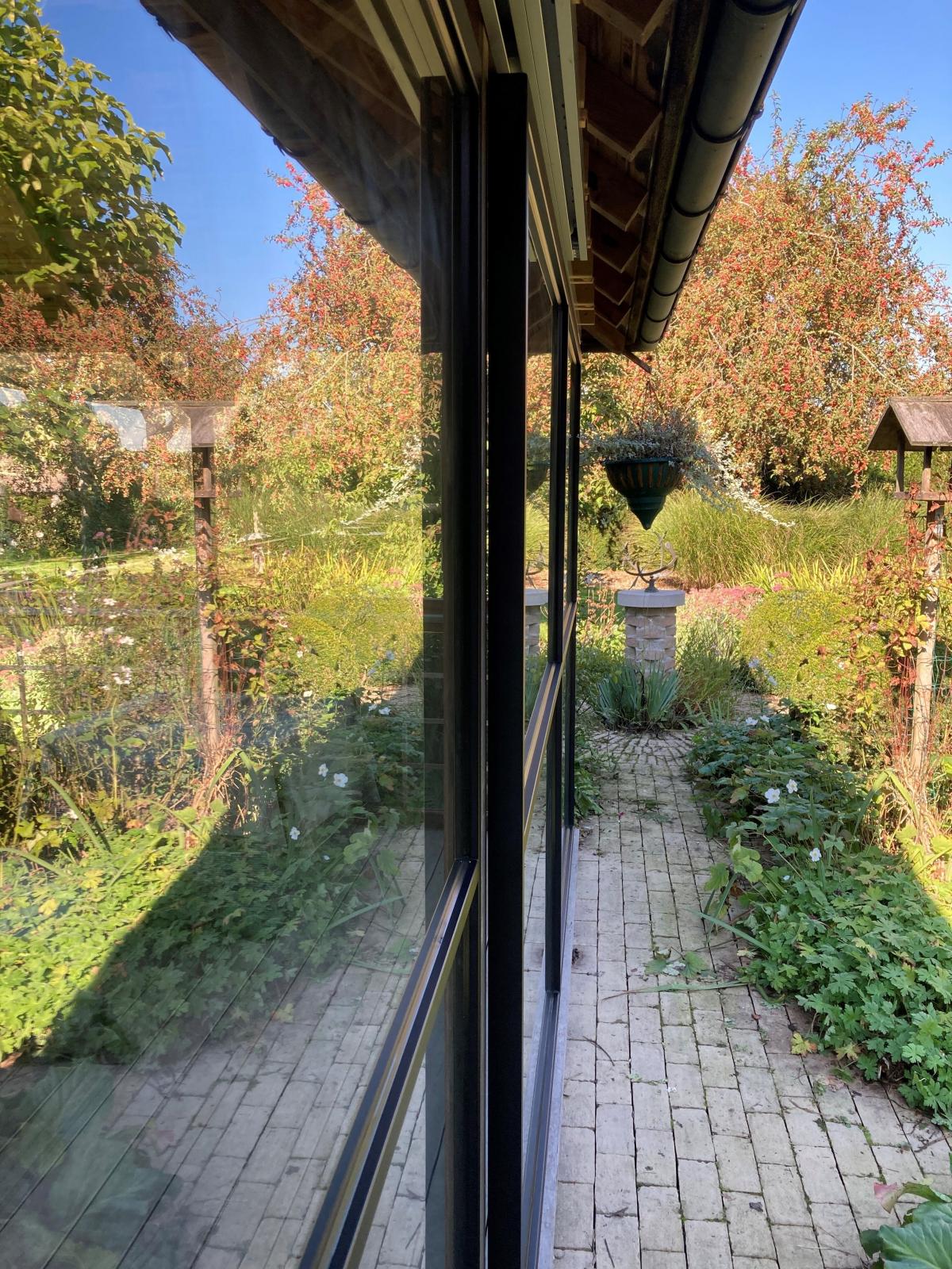 De dubbele smeedijzeren - stalen schuifdeuren hebben onzichtbare wielen. Het glas is aan beide zijden met een fijne siliconevoeg in de deur geplaatst.