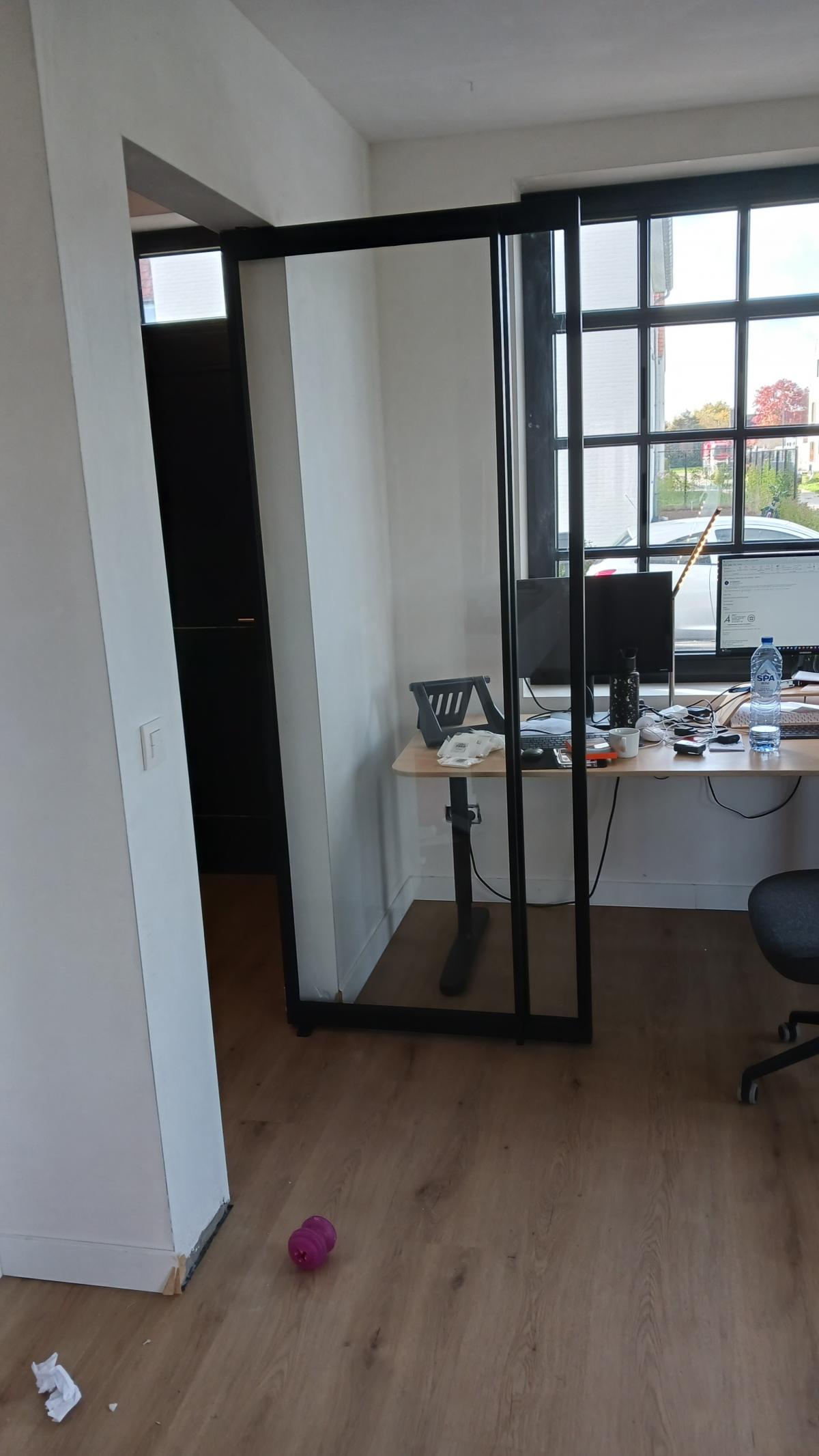 De smeedijzeren - stalen pivot-/taatsdeur heeft geen glasverdelingen. Het glas is aan beide zijden met een fijne siliconevoeg met de deur geplaatst.