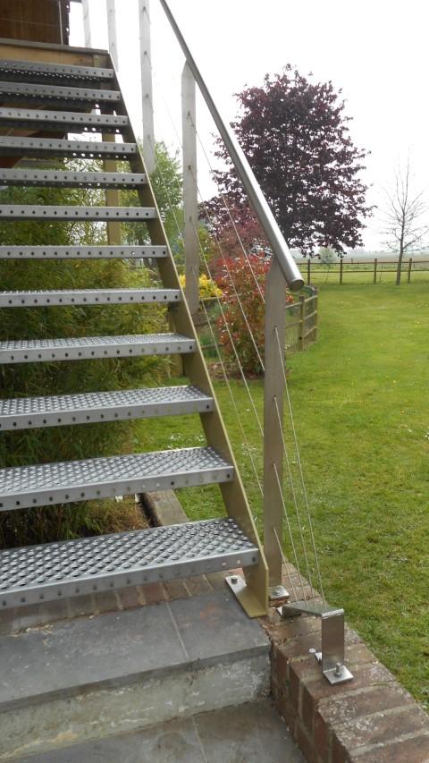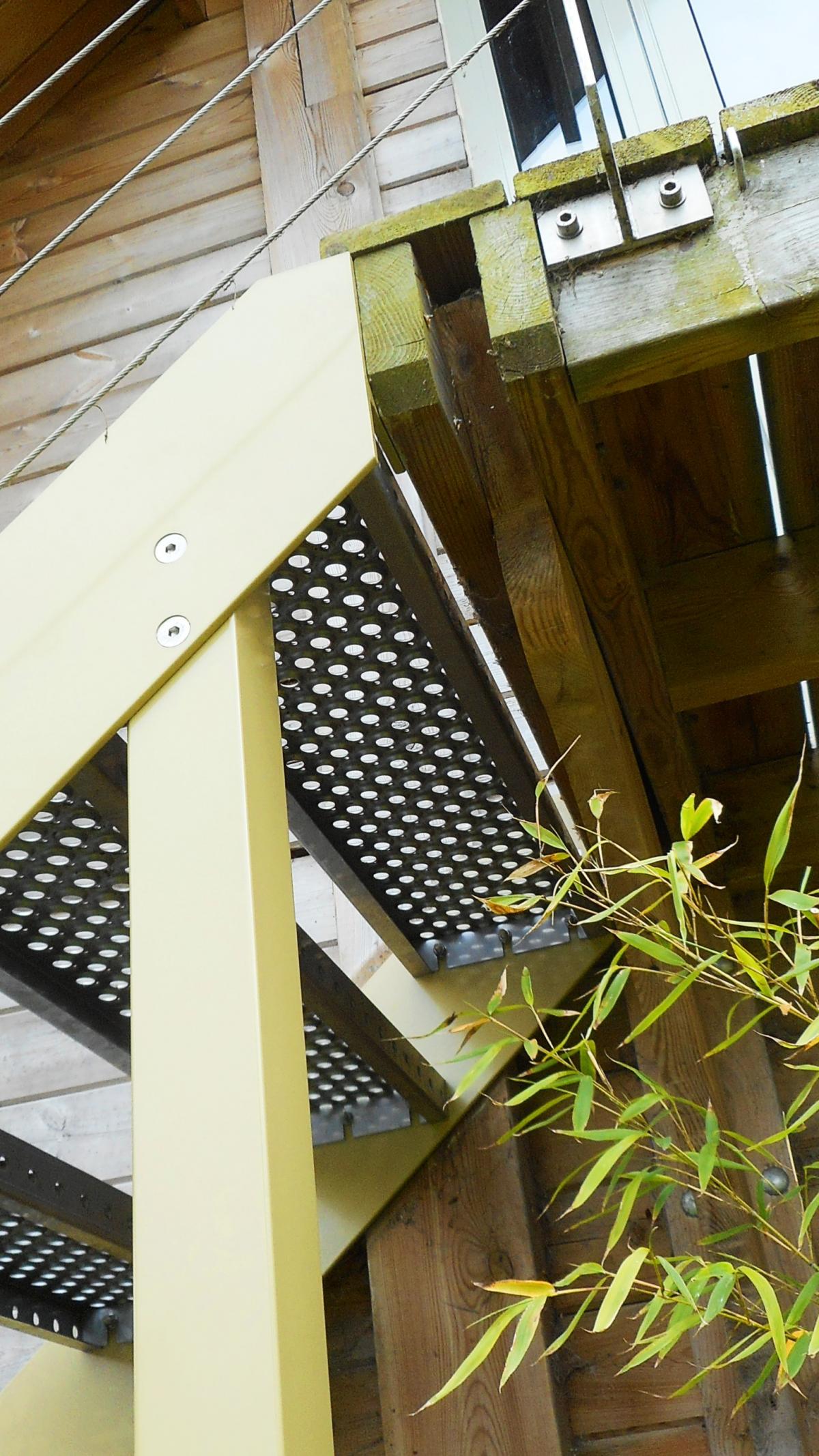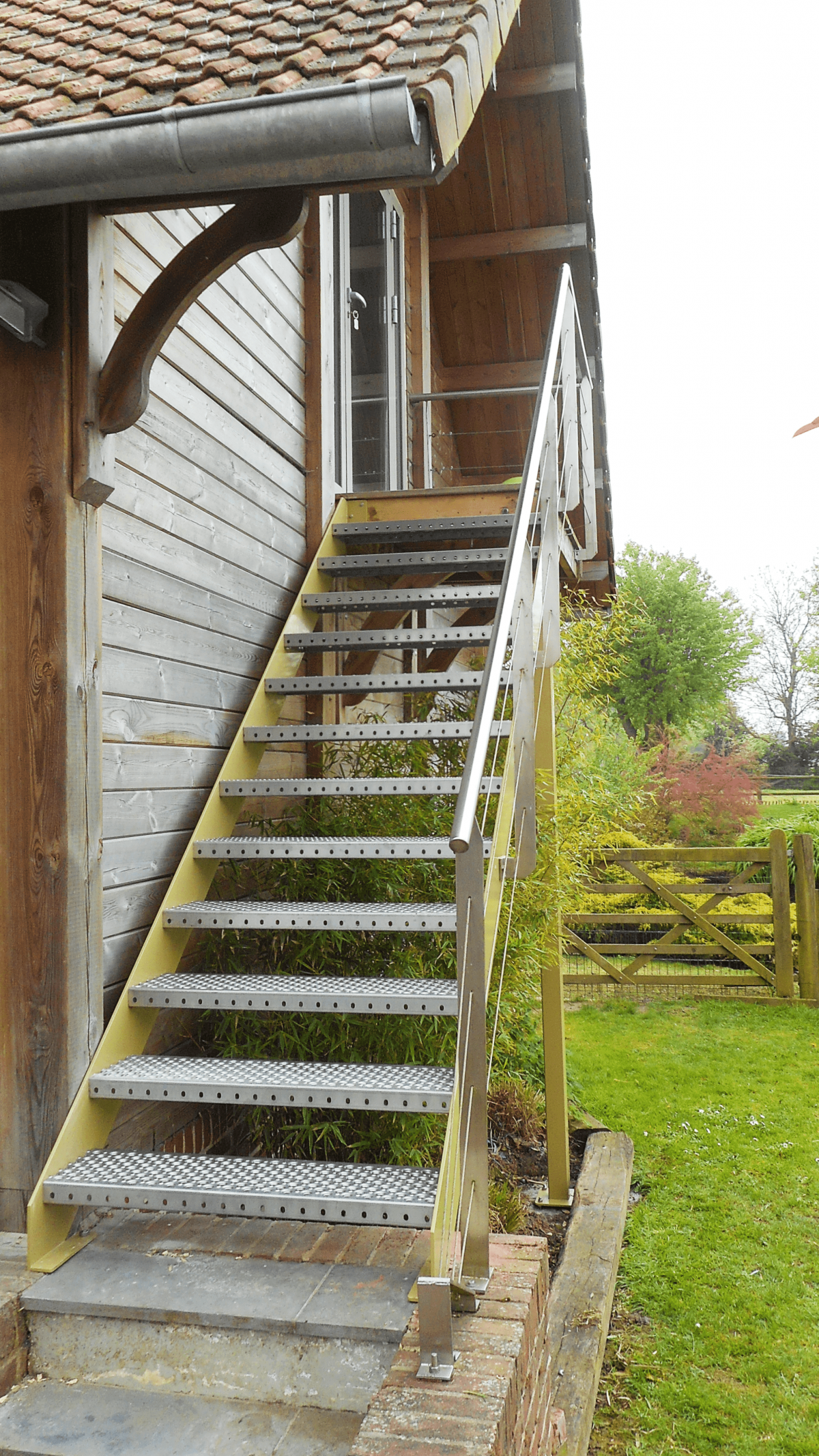 De inox gelakte buitentrap van de woning heeft twee zijtrapbomen en is afgewerkt met geperforeerde inox antislip treden.