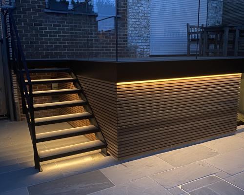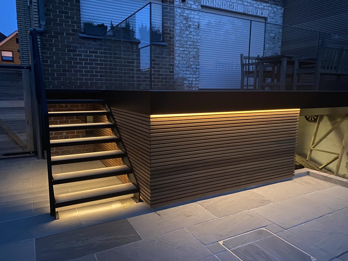 De stalen buitentrap met 2 trapbomen is zwart gelakt. De treden zijn bekleed met steen waarin een led verwerkt zit.