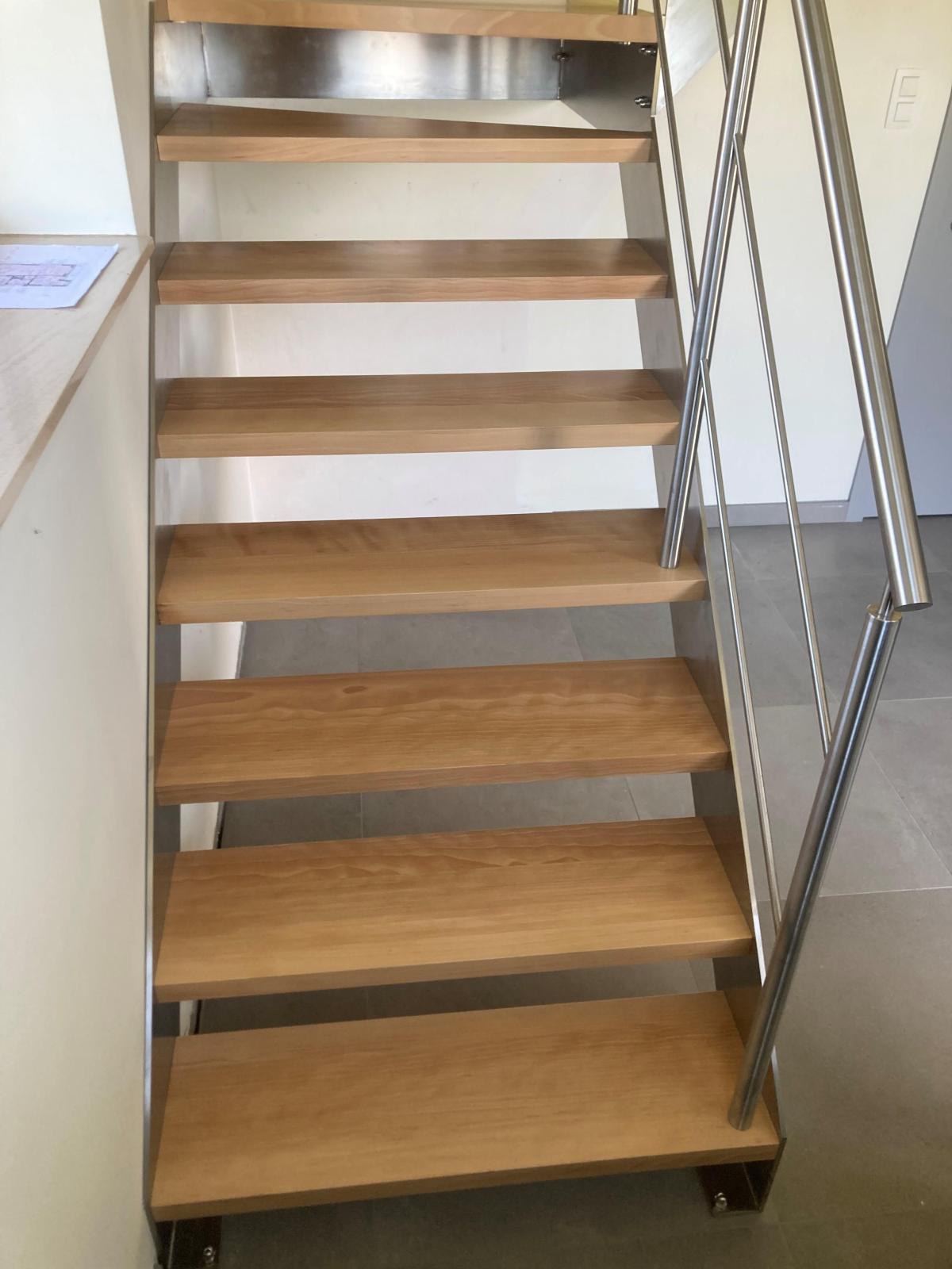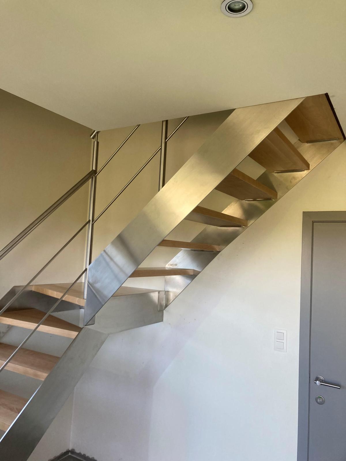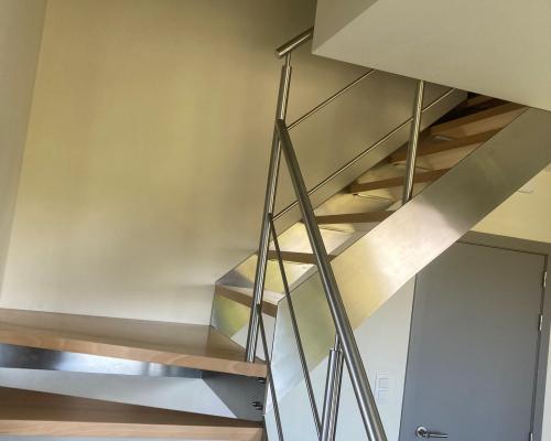 De inox kwartdraaitrap heeft 2 trapbomen met een palier. De treden zijn beuk naturel vernist. Op de trap staat een inox trapleuning met horizontale tussenstijlen.